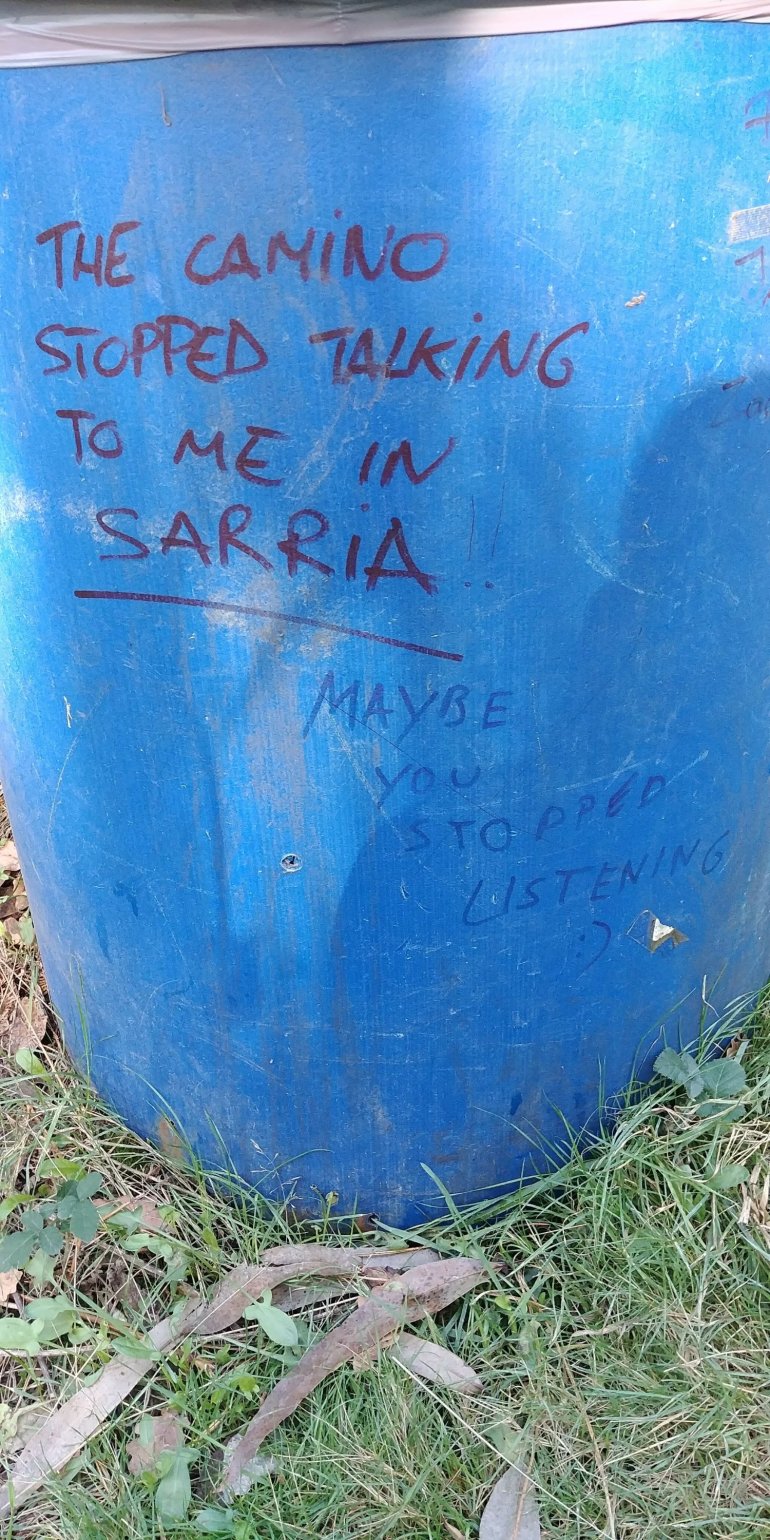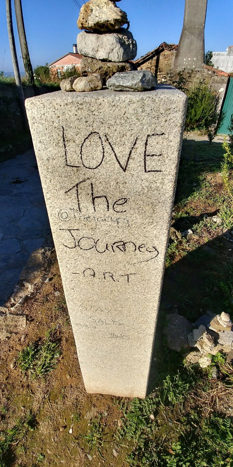 Day 15: Boente to Santa Irene to Astrar – 25 km, 7 hours Day 15 – Part 2: Astrar to O’Pedrouzo – 2.9 km, plus 2 km, 2 hours Approximately 30 km in total today. Today was the 2nd last stage of the Camino Frances. I began the day with about 47 km to Santiago. As I departed for Santa Irene I experienced a mix of emotions. I had only a few hours sleep due to some intense snoring in the albergue and I wondered if I would have the energy required for the big day ahead. I was also excited, being so close to Santiago and to the “end.” But then I remembered to continue to savour the journey and that there was no rush to get there. I set the intention of walking with my family in mind – my parents, siblings, nieces and nephews and my beloved Joel. I had spent time with friends and extended family, who remained in my heart, but today I would Be alongside my family. As I began to walk I thought about many of the qualities and values received and passed on from my parents as individuals and as role models. Things like honesty and integrity, compassion and generosity. And the importance of family. Of acceptance and tolerance and inclusivity. My parents are good people. I love them deeply and I am grateful for all they have taught me and all I continue to learn from them. I see now all they contributed to me being awarded the “Christian Spirit Award!” On a more cultural level, my passion for music and dancing, hosting and social skills come from both parents. They had a vinyl collection (RIP Chuck Berry) and very early on, like for my 7th birthday or so, bought me a Mickey Mouse record player along with my first two records – an Elvis Christmas and The Jungle Book soundtrack. I LOVED that record player – it was blue and white and Mickey´s arm would glide across the record, the needle in his hand with the black glove on it! I started collecting vinyl and still have some of my early records to this day. Thanks also to my cousin Laura Nemchin who also nurtured the music and vinyl bug! I definitely got my interest in fashion and design from my mom. And thanks to her, thrifty shopping skills. Her ability to beautifully decorate a room on a $5 budget is awe-inspiring!! This trait supported my champagne taste on a beer budget! And from my dad I got being a sales person with integrity. And the ability and desire to share things I believe in. The connector in me also comes from him. After that bit of parent time, my mind wandered and I became distracted by – or present to – my surroundings. Treasures are abundant on the Camino. Along the Way I picked up many sorts of organic matter, carrying some with me for short periods of time and keeping others until the end. Rocks, branches, nuts, leaves and herbs infused with thoughts, wishes and prayers all became part of the altars I created on the Camino and left at various sites. Over the course of the day different people would pop into my mind. I would leave a stone in their honour or have a chat with them (in my mind or aloud) or draft a WhatsApp message or email to them to honour the gift of their presence. I kept bringing myself back to my family and I noticed what I thought was a resistance to walk with my family. Or something. And then I realized what it was – it was as if, for the first time on the Camino, I had an attachment to something rather than just letting things happen or arise naturally. I was like, I have walked with many people and today, being the second last day, I want to focus on my family. I wanted to see or uncover and heal anything that was left to. Upon further contemplating this I realized that all was good. That I was very happy about and satisfied with the relationships I have with my parents and that there was nothing to heal at this time. I had returned to the Ottawa area and spent valuable time with each of them and over that time I learned to accept each beautiful individual for who they are. And so I let go of anything I thought I might need or want to happen and walked on in peace and lightness. Soon after I came across a mother and her seven-year old daughter from Germany. They are taking a year to travel in a camper van with their two children. How awesome is that! As part of the adventure they decided to walk the Camino for a week. After one day the five-year old son decided he did not want to continue, but mother and daughter did. So it was decided that father and son would drive ahead and meet mother and daughter for the nights. Of course that got me thinking – and feeling about my nieces and nephews and how incredible it would be to do something of the like with them. Or at least holiday with them. At this point I was walking with a woman I had met the day before and she began to share some personal things about her relationship with her family, specifically her sisters. And that got me thinking about my responsibility an older sister – and my role as an aunt. And this caused me a bit of a shock…making a connection as I recalled leaving Ottawa at 21, when my siblings were very young – and I cried as I wondered if they felt abandoned by me. And now, I left Ottawa again and my nieces and nephews are young! Maybe my siblings did feel abandoned. Maybe it seemed as if I did abandon them but it was in search of me. If I did, it was not consciously. At that time, and throughout my teens I was learning to take care of and to love me. I needed myself and all the resources I had to deal with my life and what I had experienced in my young life. I love my siblings and I missed a big part of their lives and sometimes I wish I hadn´t. That I could have been more present during my years on the coast. But I did my best. That is my truth and that I know. So be gentle on yourself I reminded myself. After 13 or so years on the coast I had returned to Ottawa. Inspired by the birth of my first niece. And then a nephew and another and another niece and nephew and another. And I cherished and treasured every mom